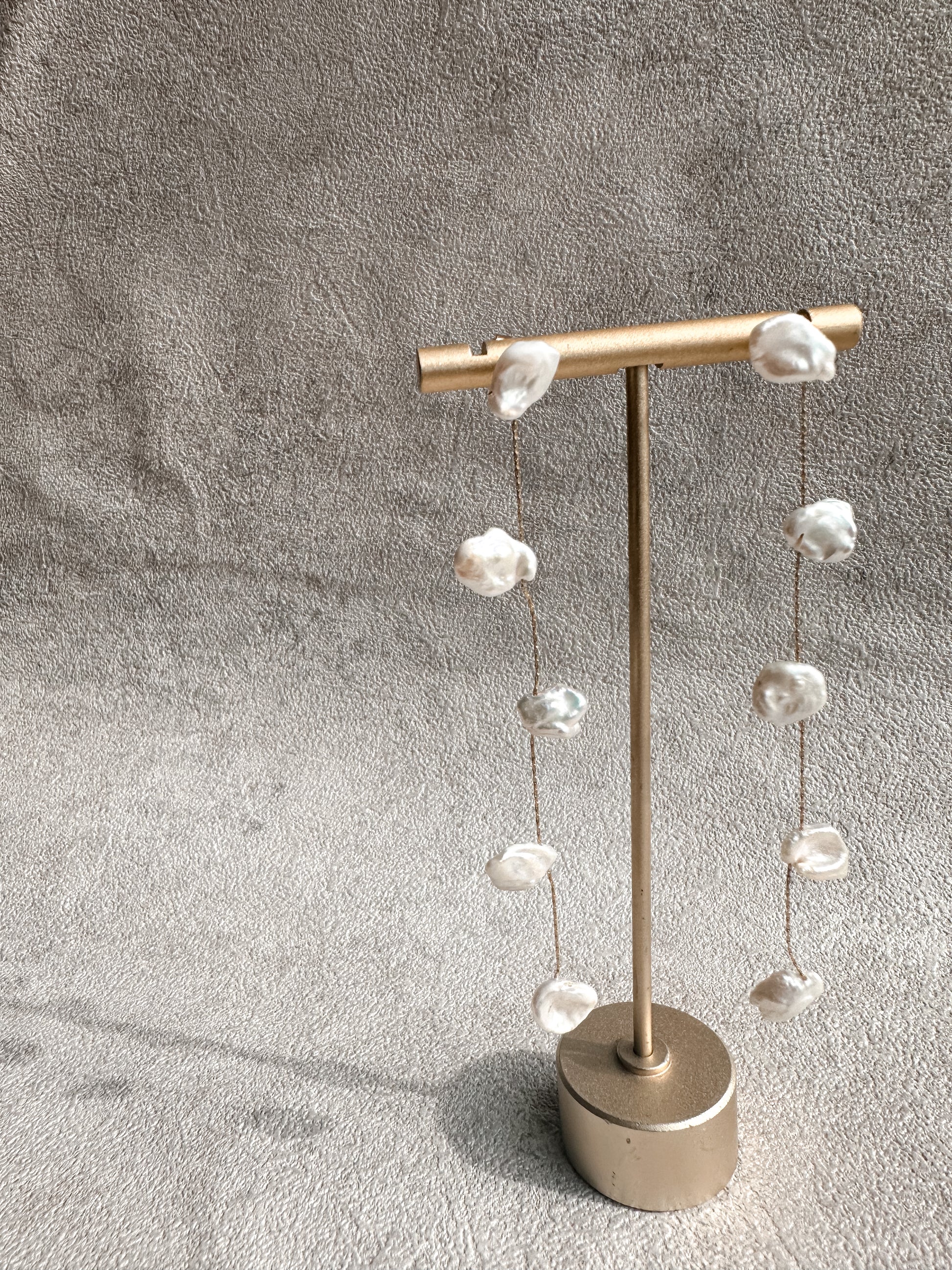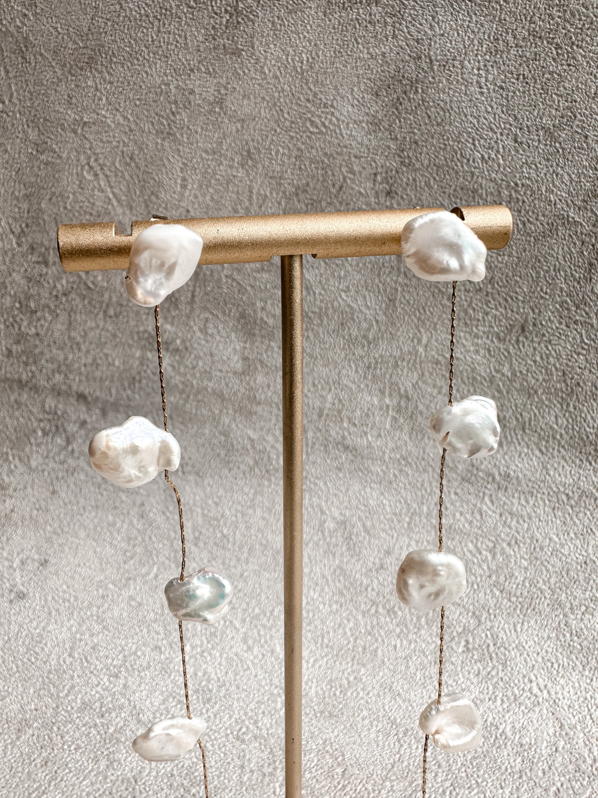 自然のままの形が美しい淡水ケシパールを連ねた、繊細なロングピアス(イヤリング)。
