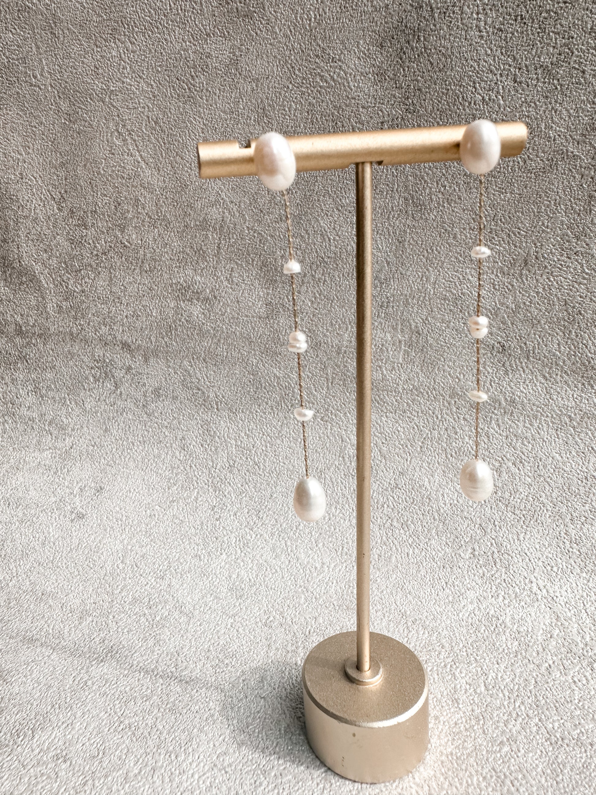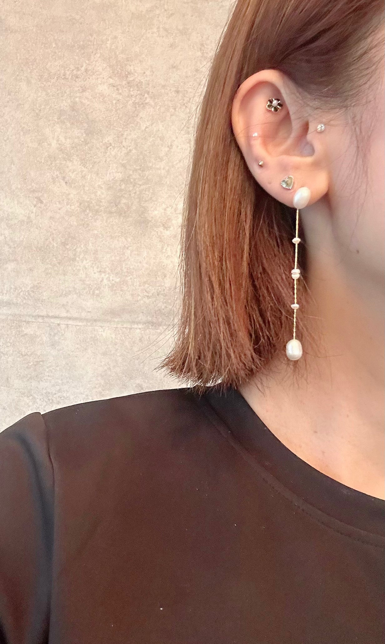 上部と下部に配した淡水パールを、中央の小粒パールチェーンでつないだ繊細なピアス(イヤリング)。