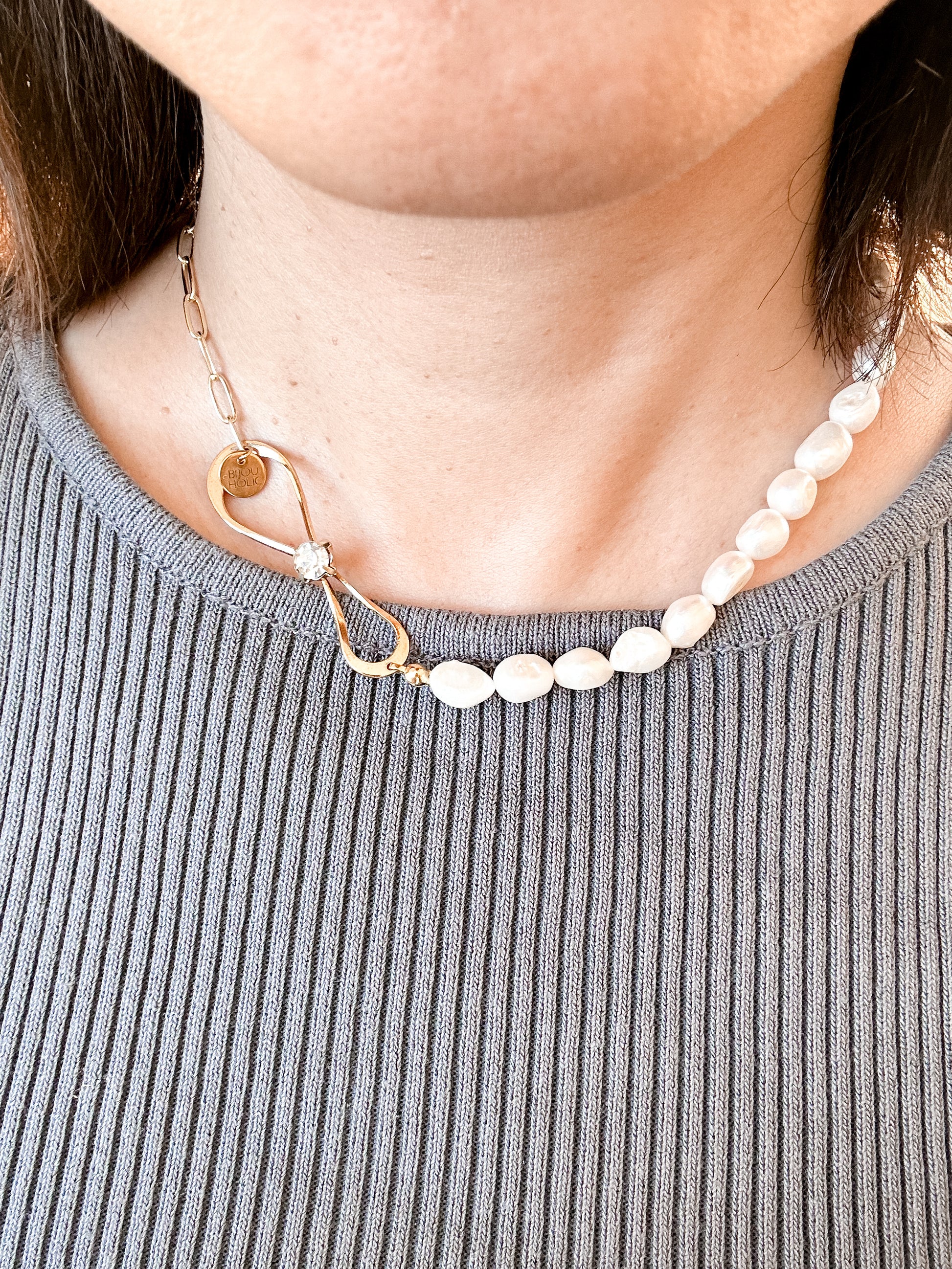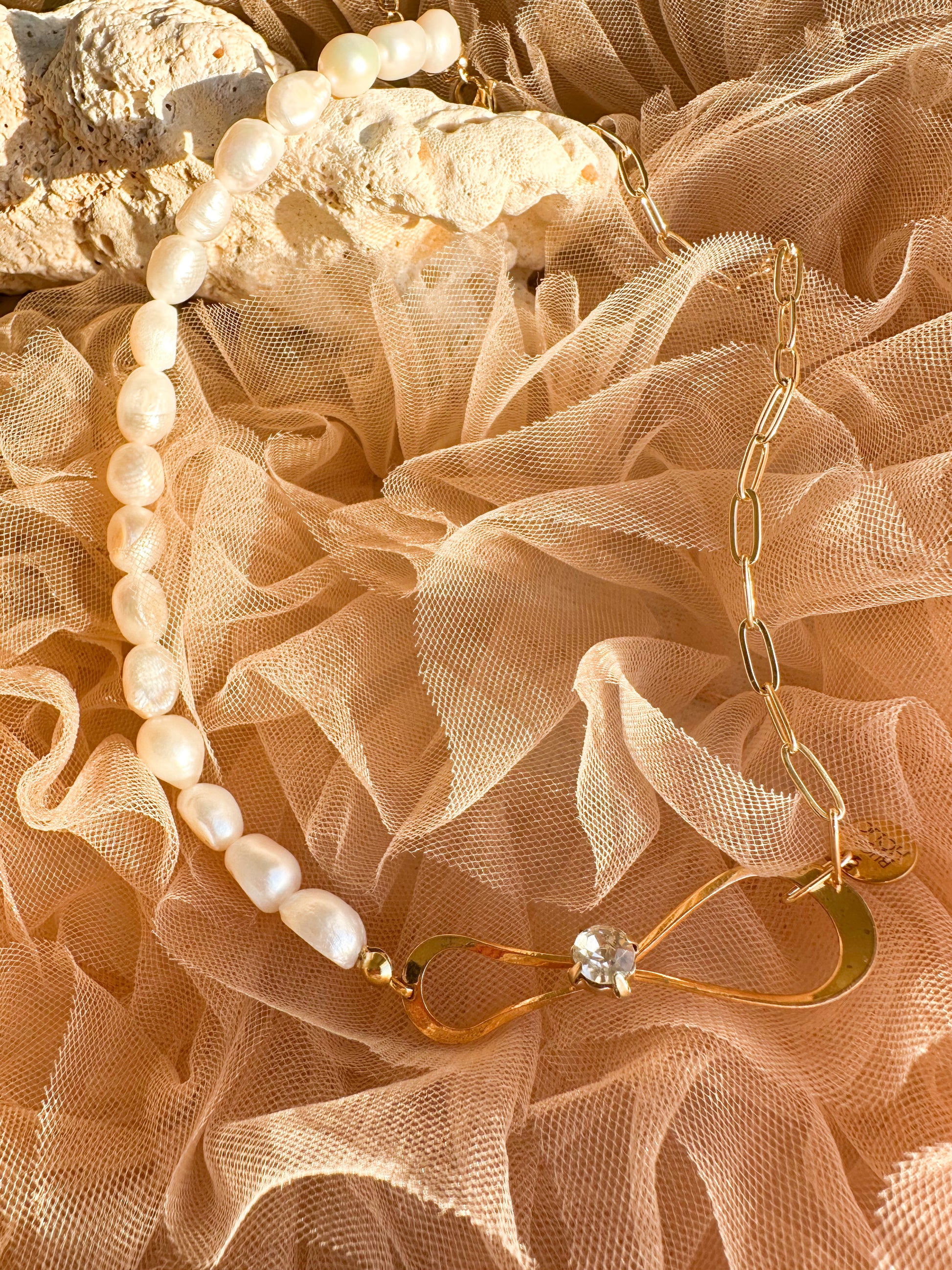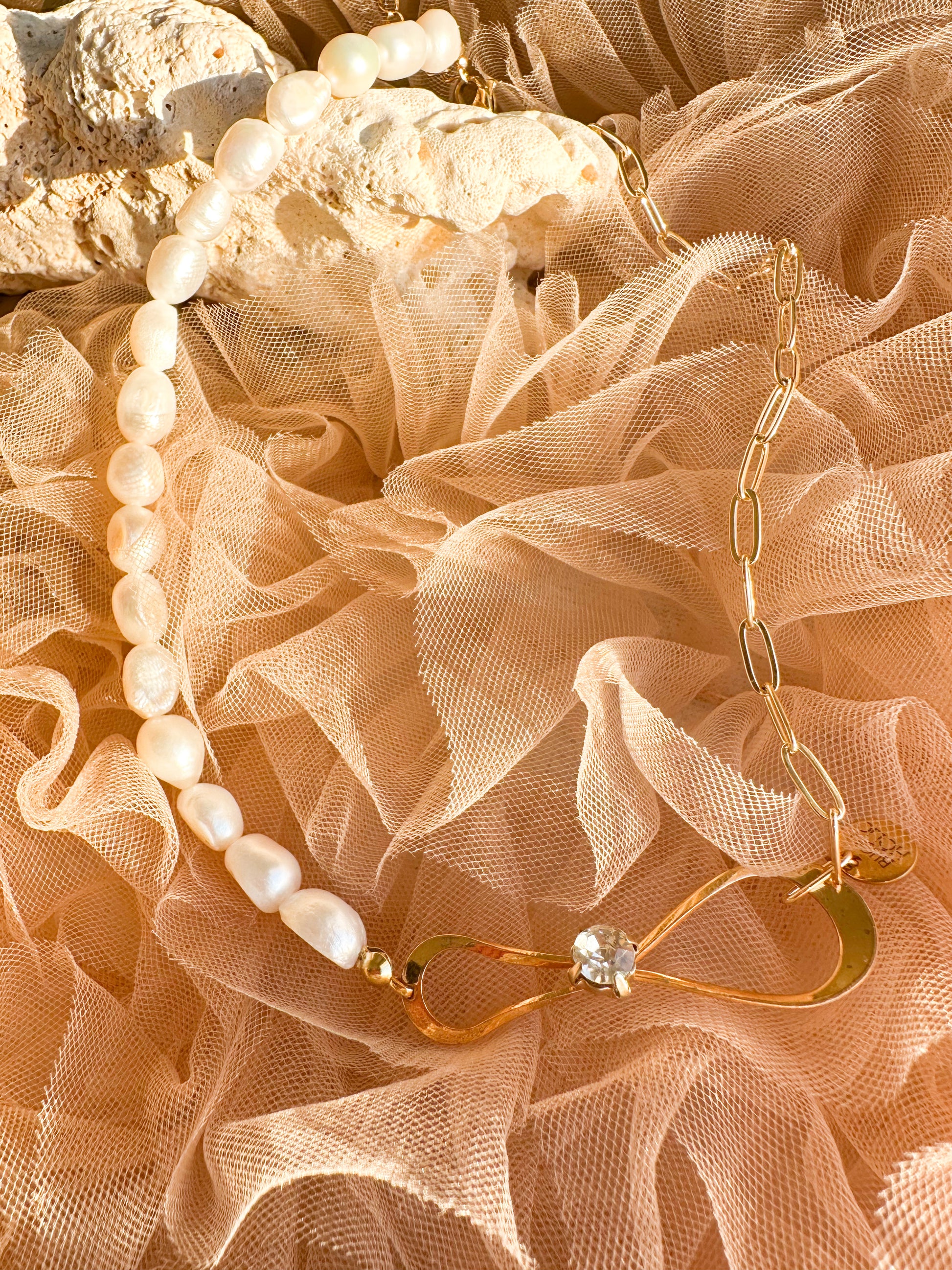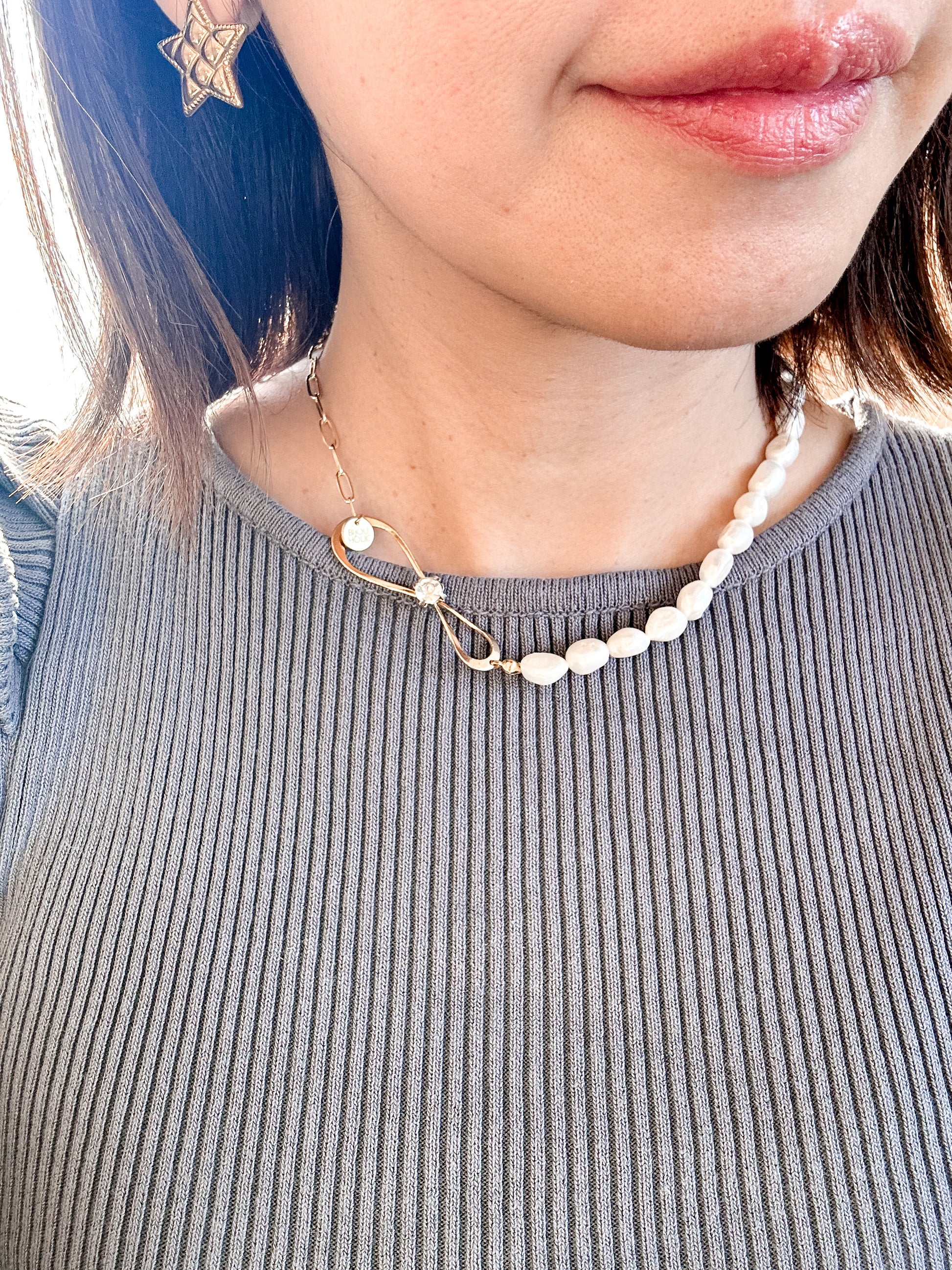 《淡水パール × ゴールドチェーン》アシンメトリーネックレス|デイリーアクセサリー・大人カジュアル・上品コーデ