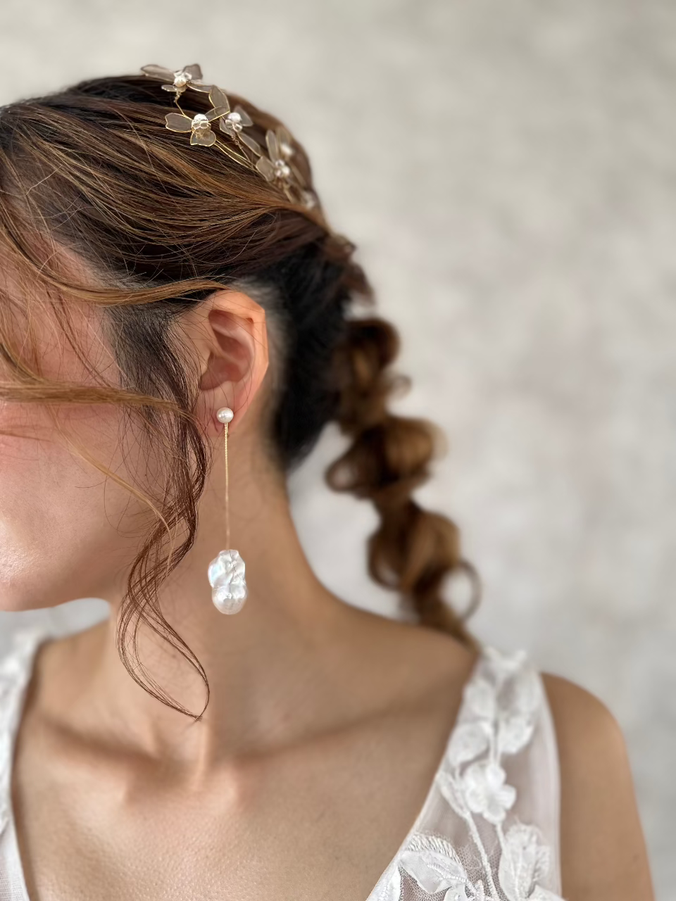 Bijouholicの「オイスターパール スイング ブライダルピアス&イヤリング」は、スタイリッシュな女性らしい洗練されたデザインで、軽井沢挙式や海外挙式、沖縄挙式やフォトウェディングなどリゾート婚でよく選ばれています。パーティや同窓会、普段用にも。