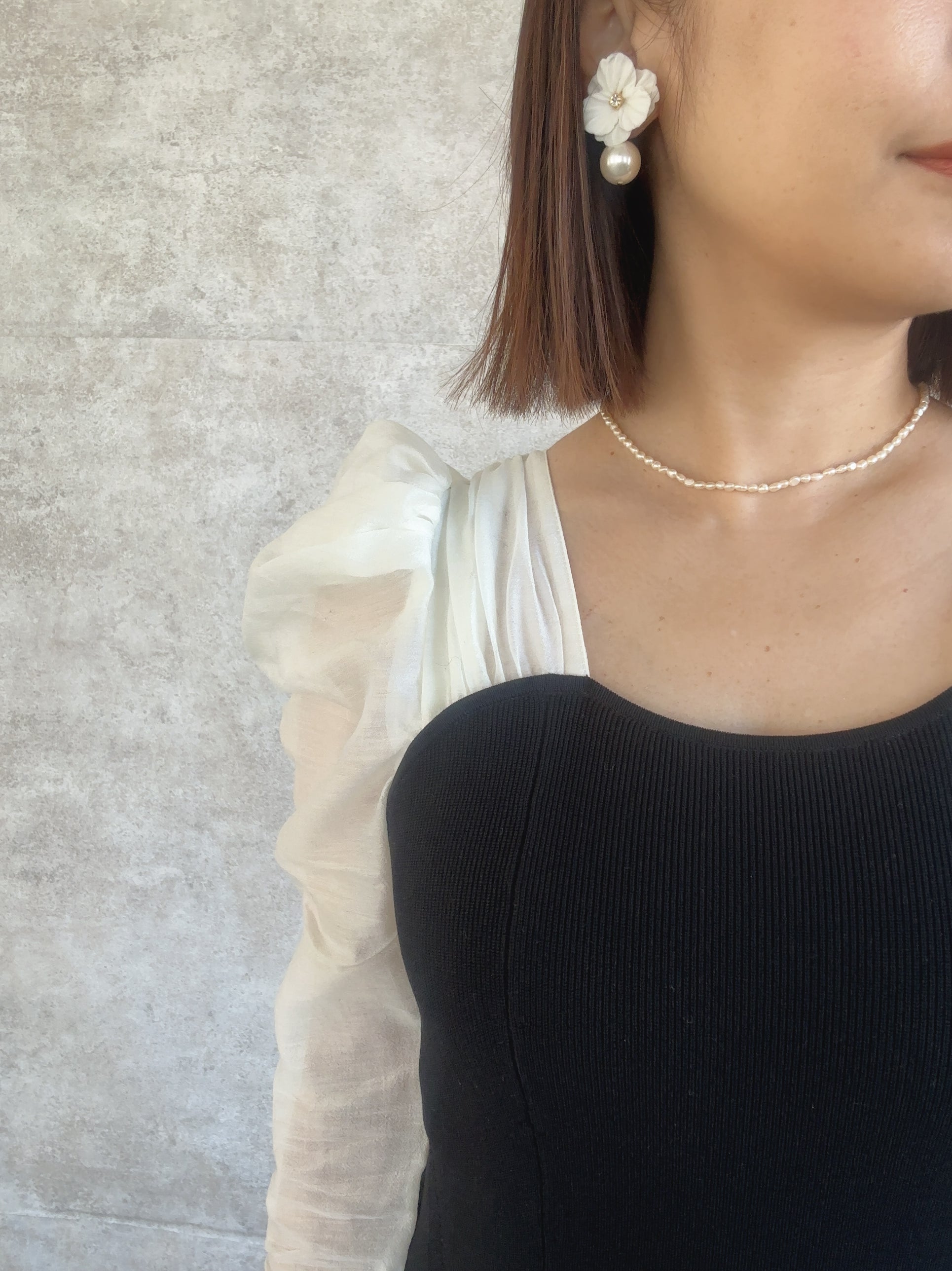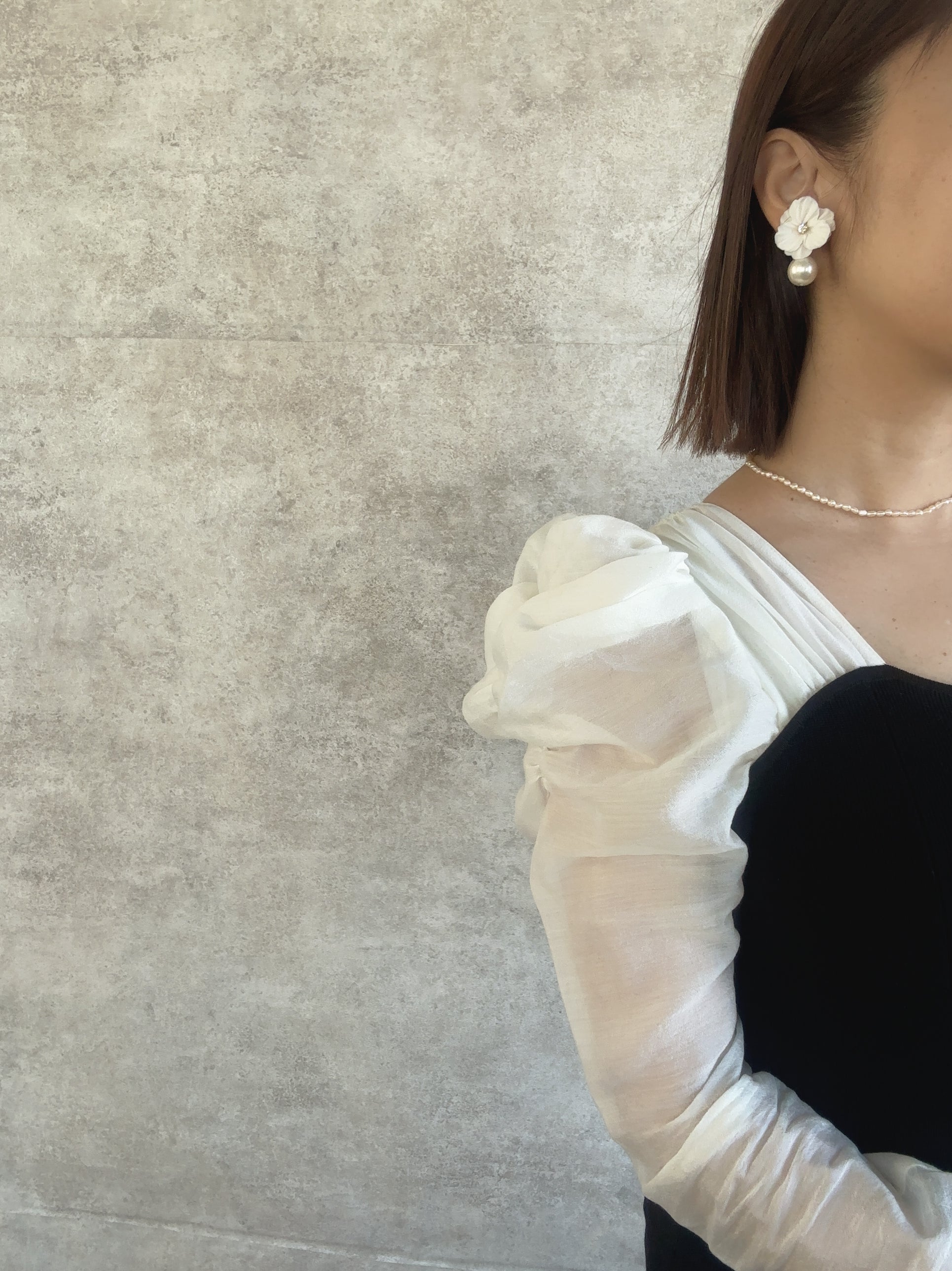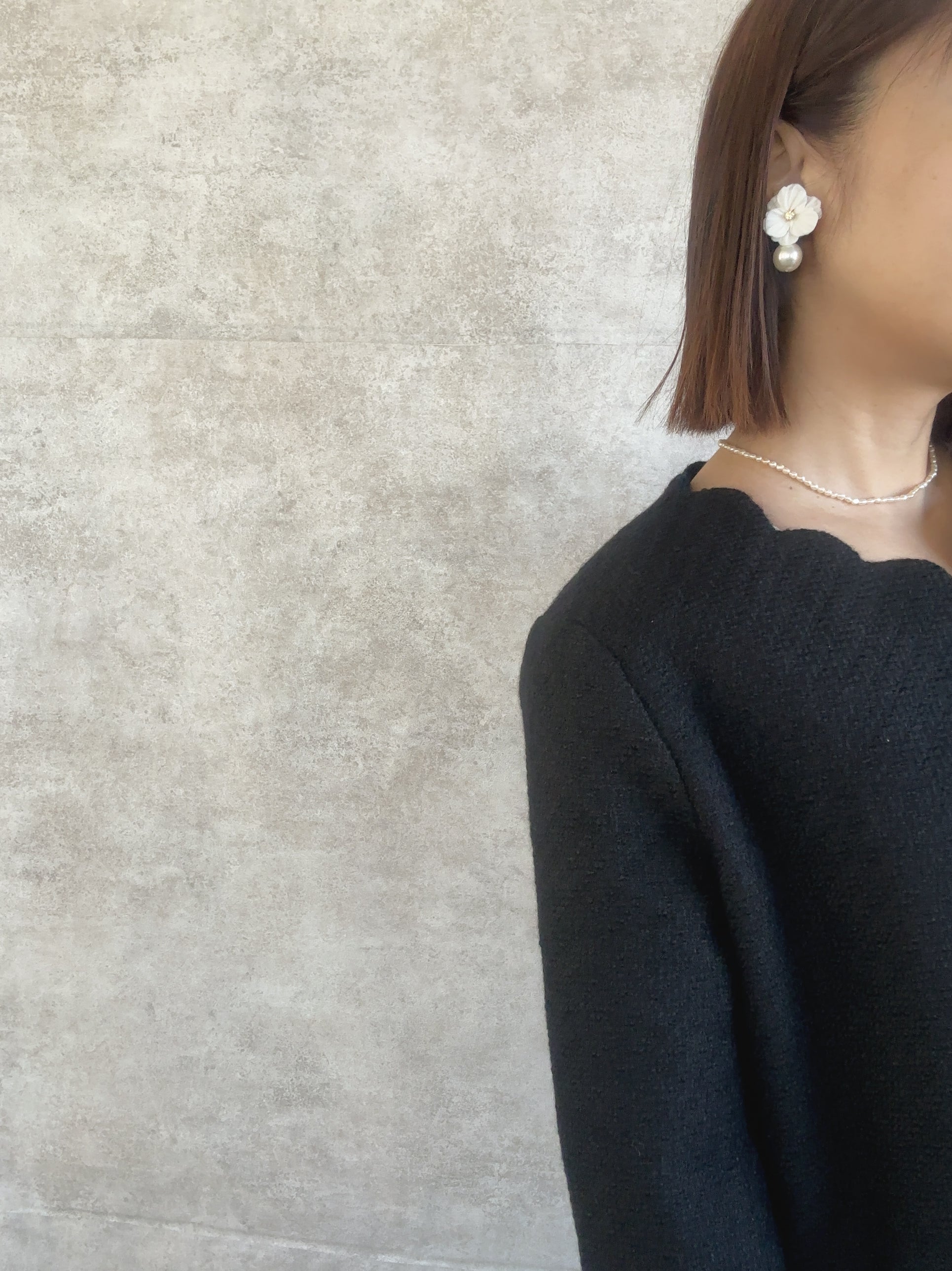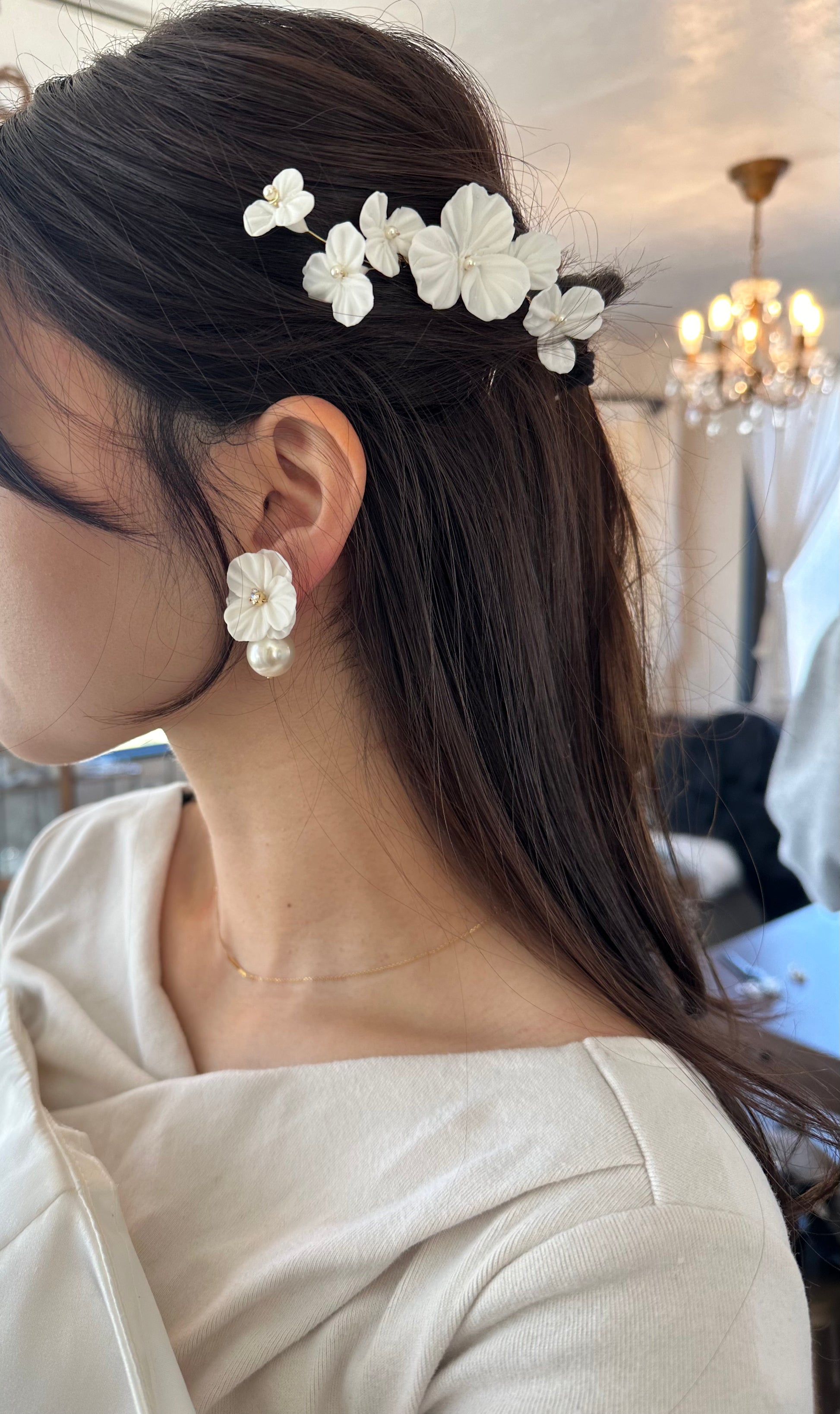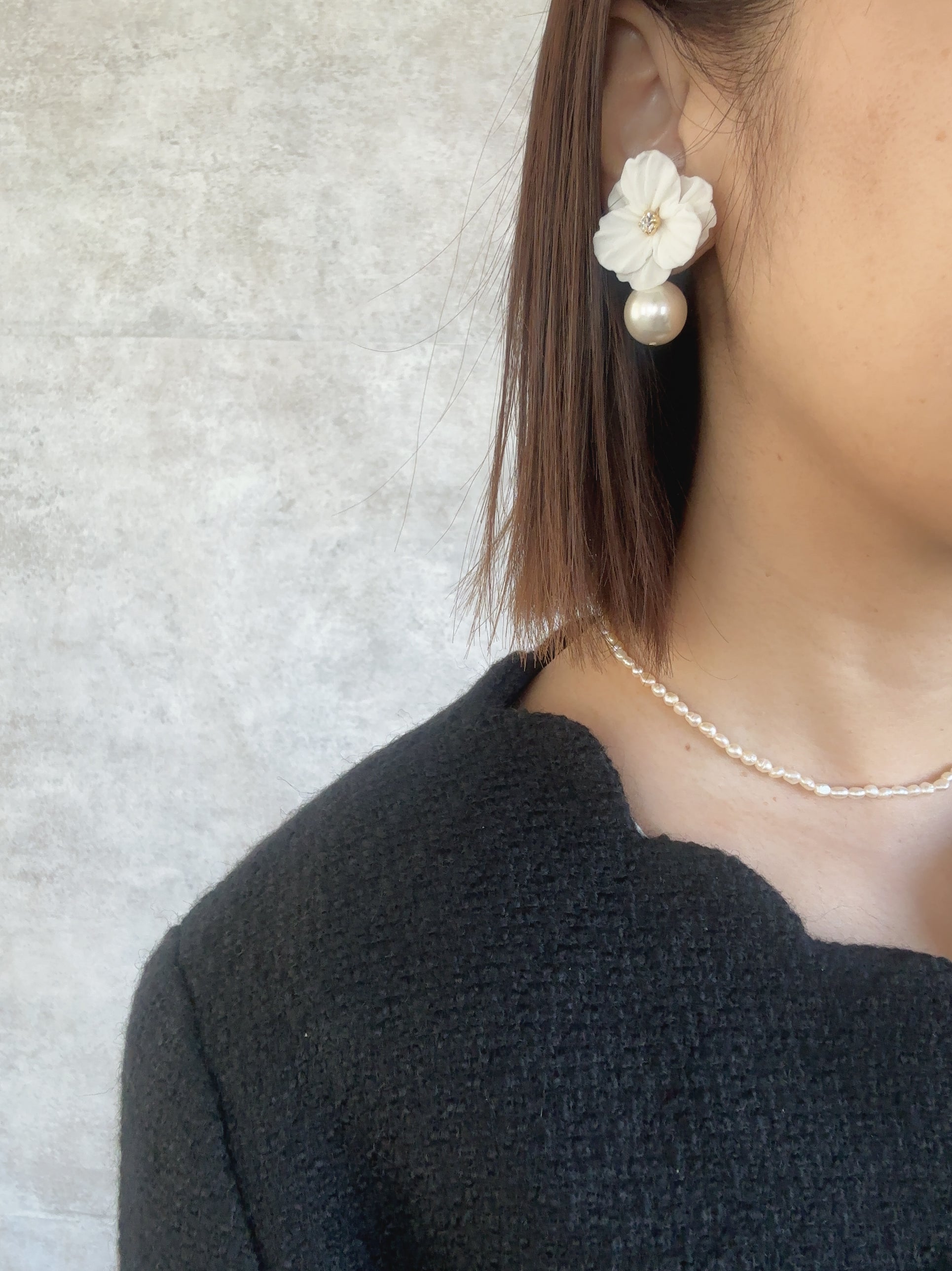 クレイのホワイトフラワーにパールの揺れるピアス&イヤリング。