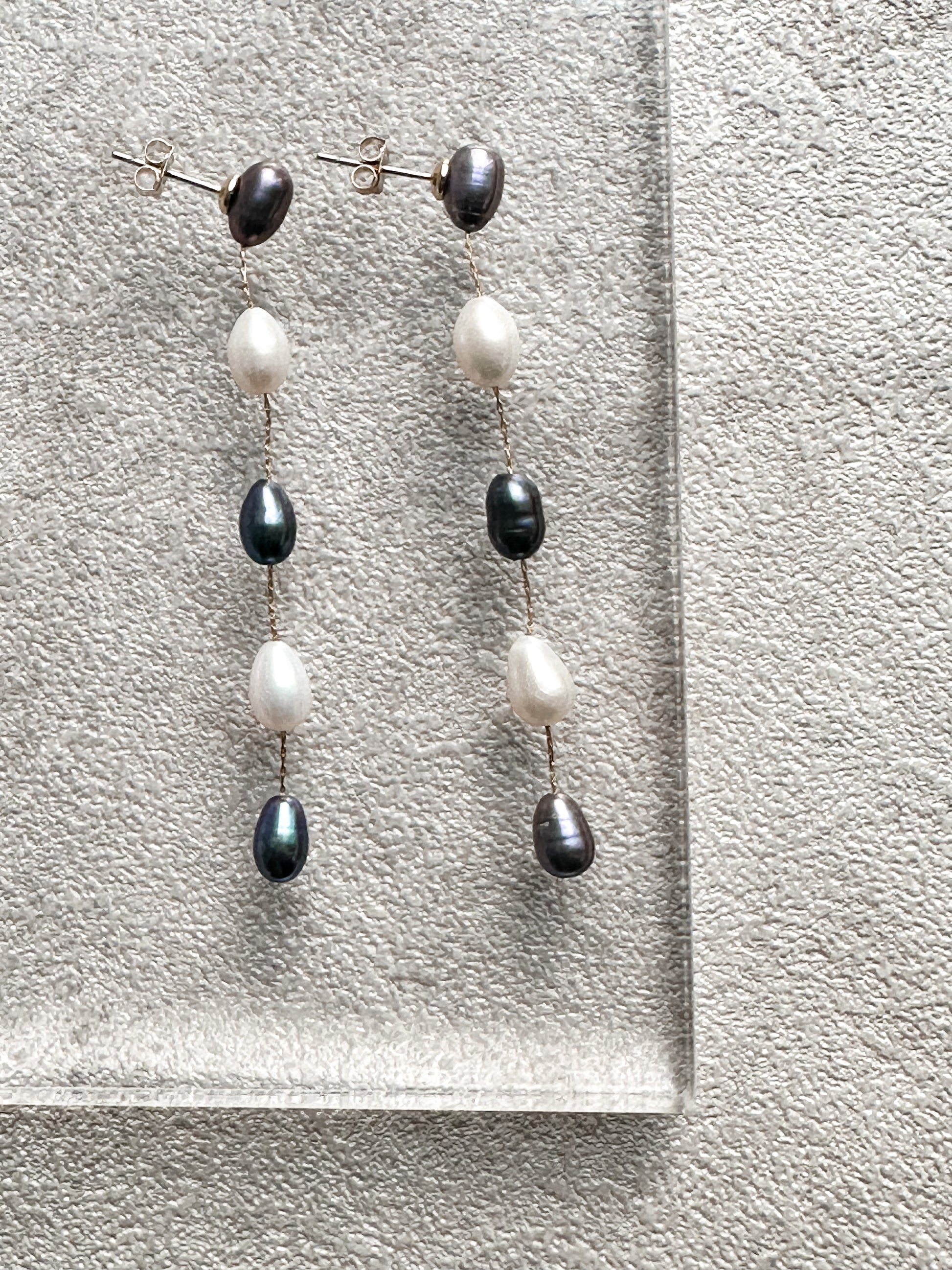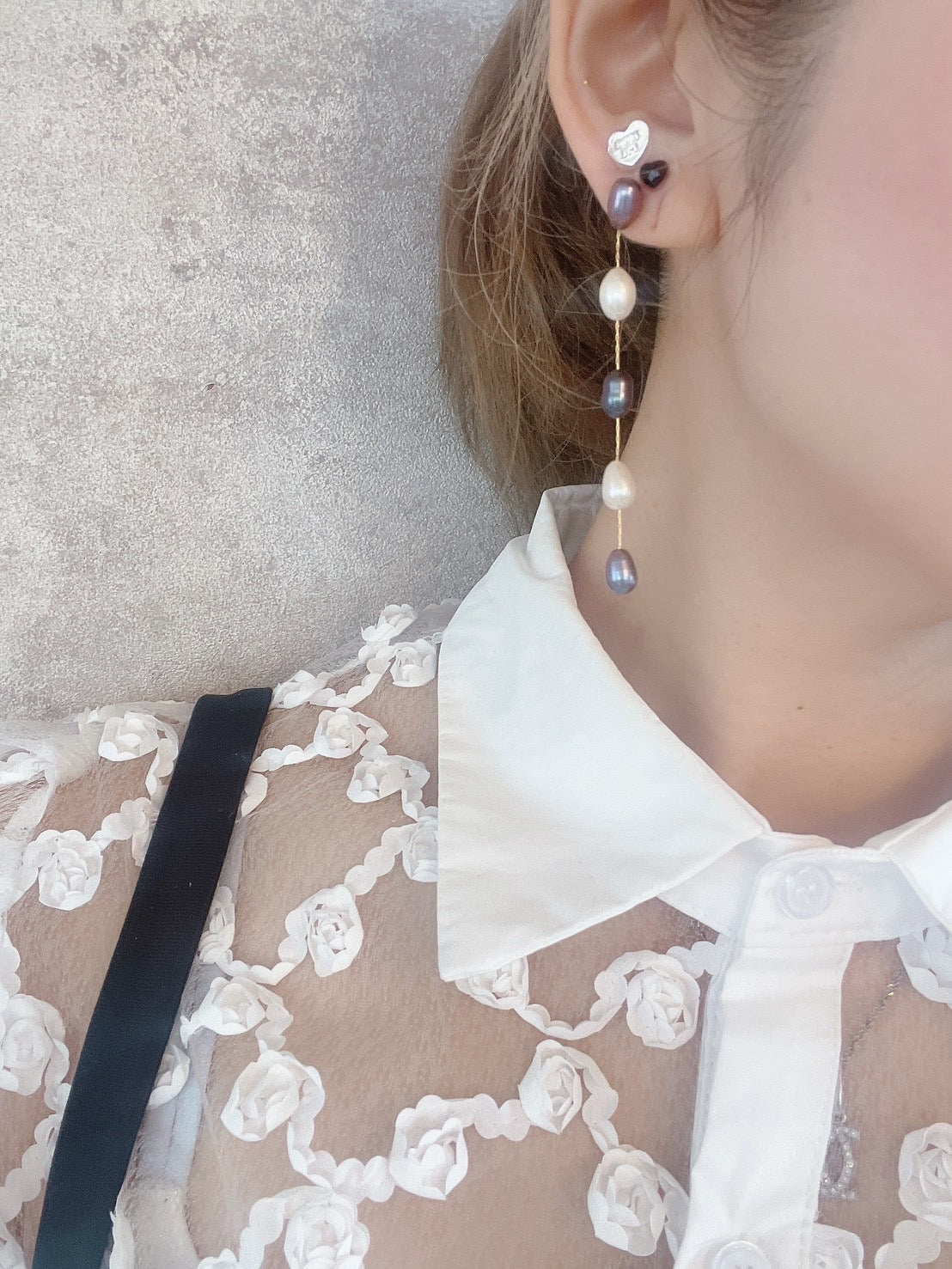 白とほんのり紫のテリの淡水パールを、繊細なチェーンで繋いだピアス&イヤリング。